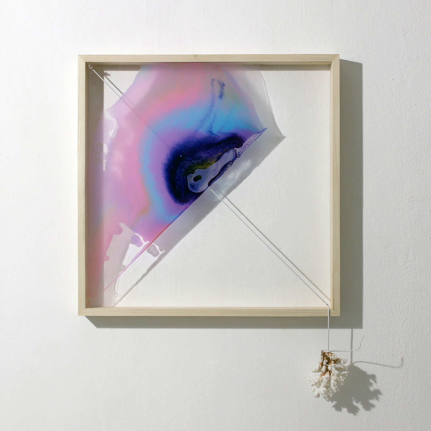 OOPHAGA. pigments, polymers, enamel, acrylic glass, tulip wood, headphone jack/cord, coral. 500mmx500mm 2017