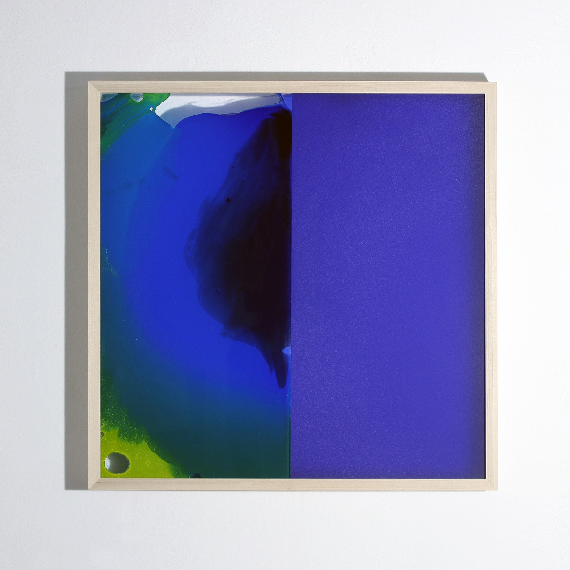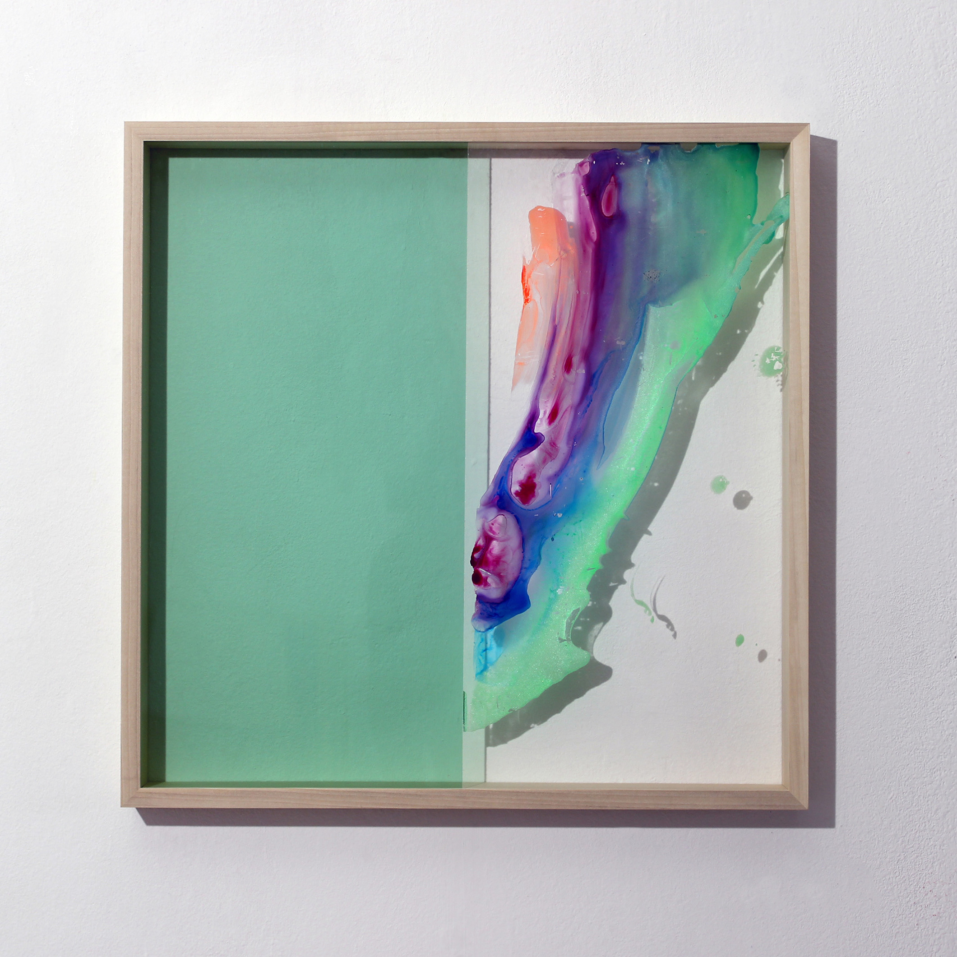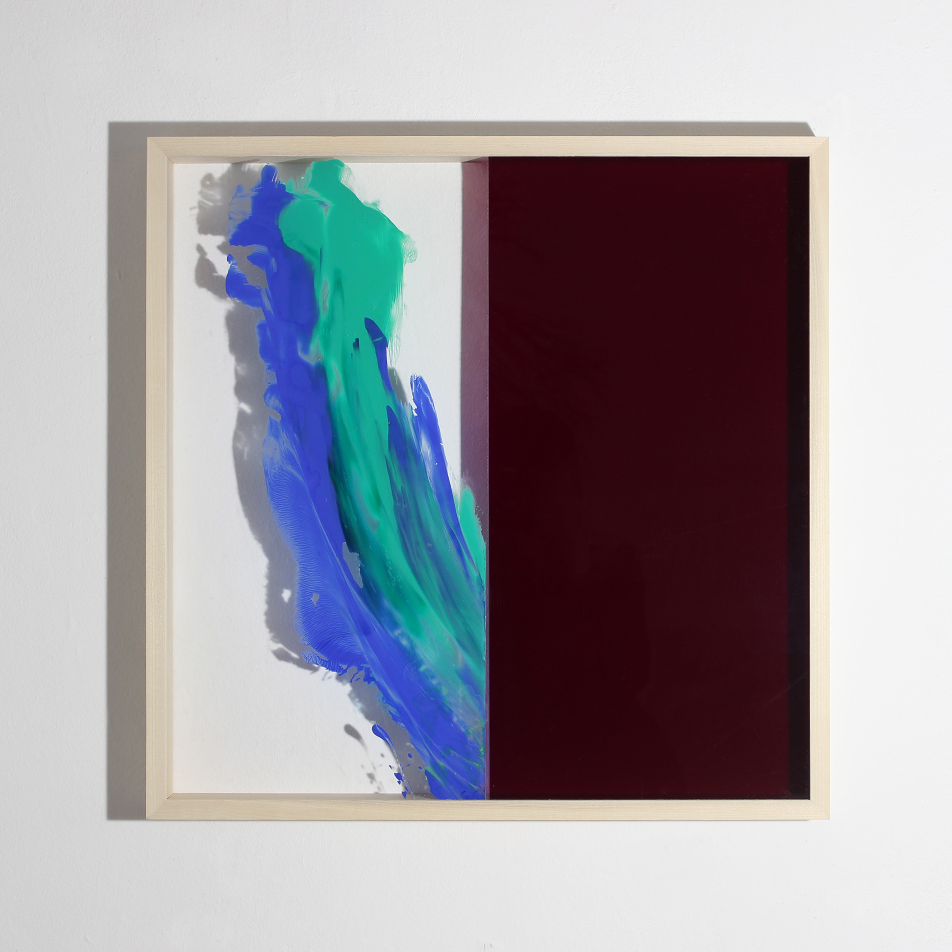 Title: LEIURUS (left) pigments, polymers, acrylic glass, tulip wood. 500mmx500mm 2017