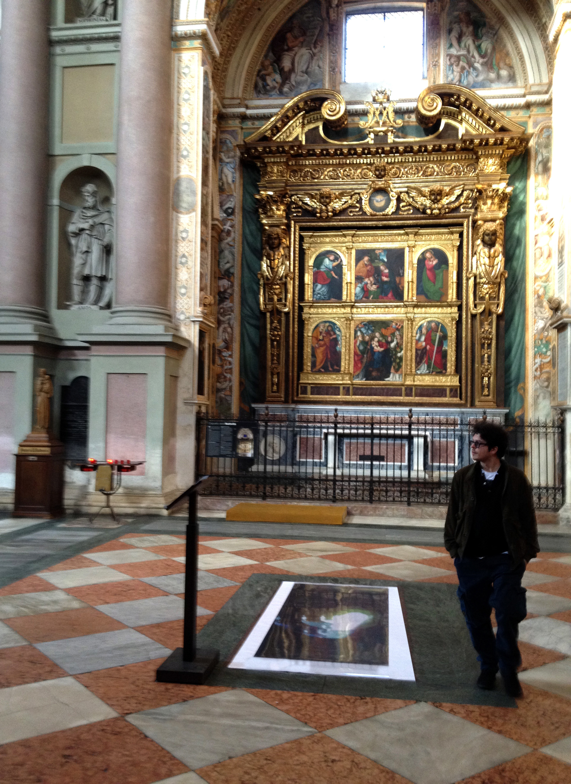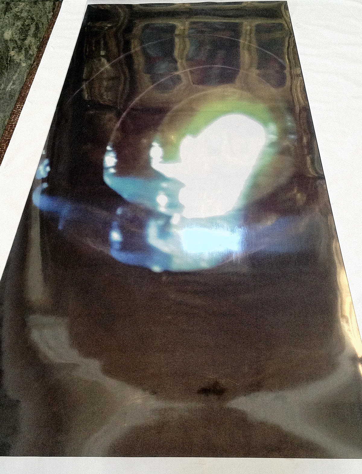 La riflessione di partenza è l’esistenza di un tramite, sorta di corrente retroattiva, fra noi e Dio, rintracciabile nell’assunto secondo cui l’uomo sarebbe il riflesso dell’imago divina. Dio è la sorgente spirituale e naturale dell’umanità: generatore di una discendenza che non abitando più nel tempo mitico ha smarrito la consapevolezza di tale legame e perciò s’è inconsciamente separata, a livello mentale, da lui; a livello della nostra vita terrena invece si è protratto il suo segno nei tratti fisiognomici che i nostri padri biologici ci hanno trasmesso.Il soggetto d’indagine dell’opera è l’atto di questa riflessione, configurata attraverso due specchi che, posti l’uno di fronte l’altro, si riflettono all’infinito. Gibson sceglie di posizionarli perfettamente paralleli e dotarli di un proprio fuoco luminoso; quando il visitatore si troverà con lo sguardo all’interno dello spazio definito dall’artista noterà la luce riverberare all’infinito. Il lavoro ha base scientifica.