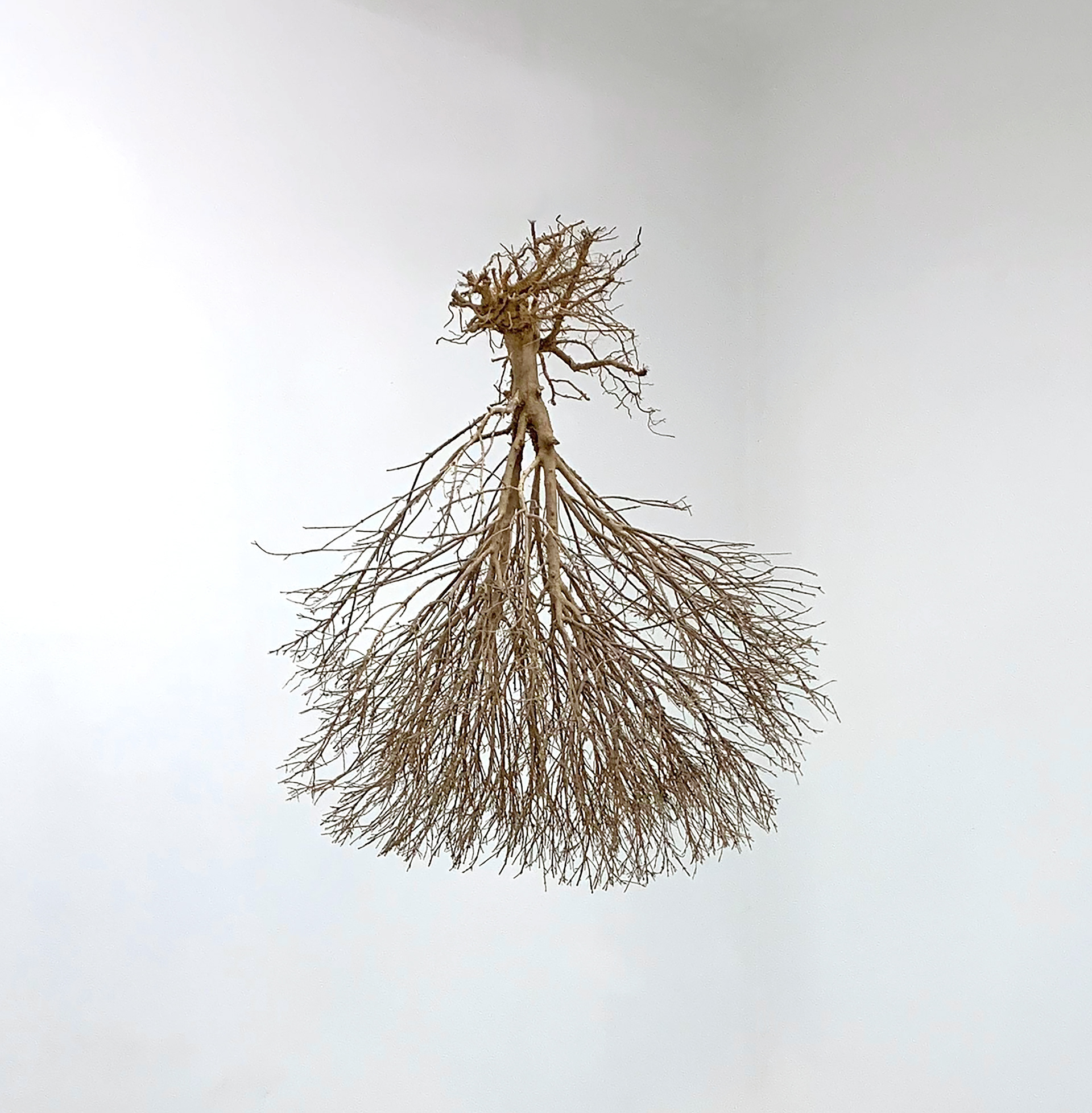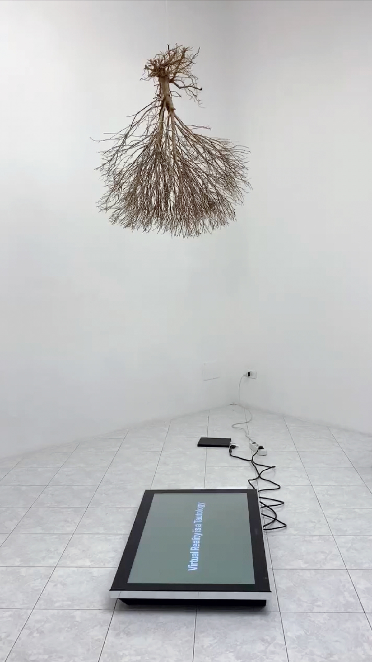 The remnant of a once living tree points earthwards towards a video of moments of time that are now non-existent. Cut from the continued current of life, these seen moments are now dead. While the video is a re-presentation, the viewer who contemplates the work stands in a continued life stream. The work invited the viewer to take a small twig from the inverse tree if they accepted their own death.