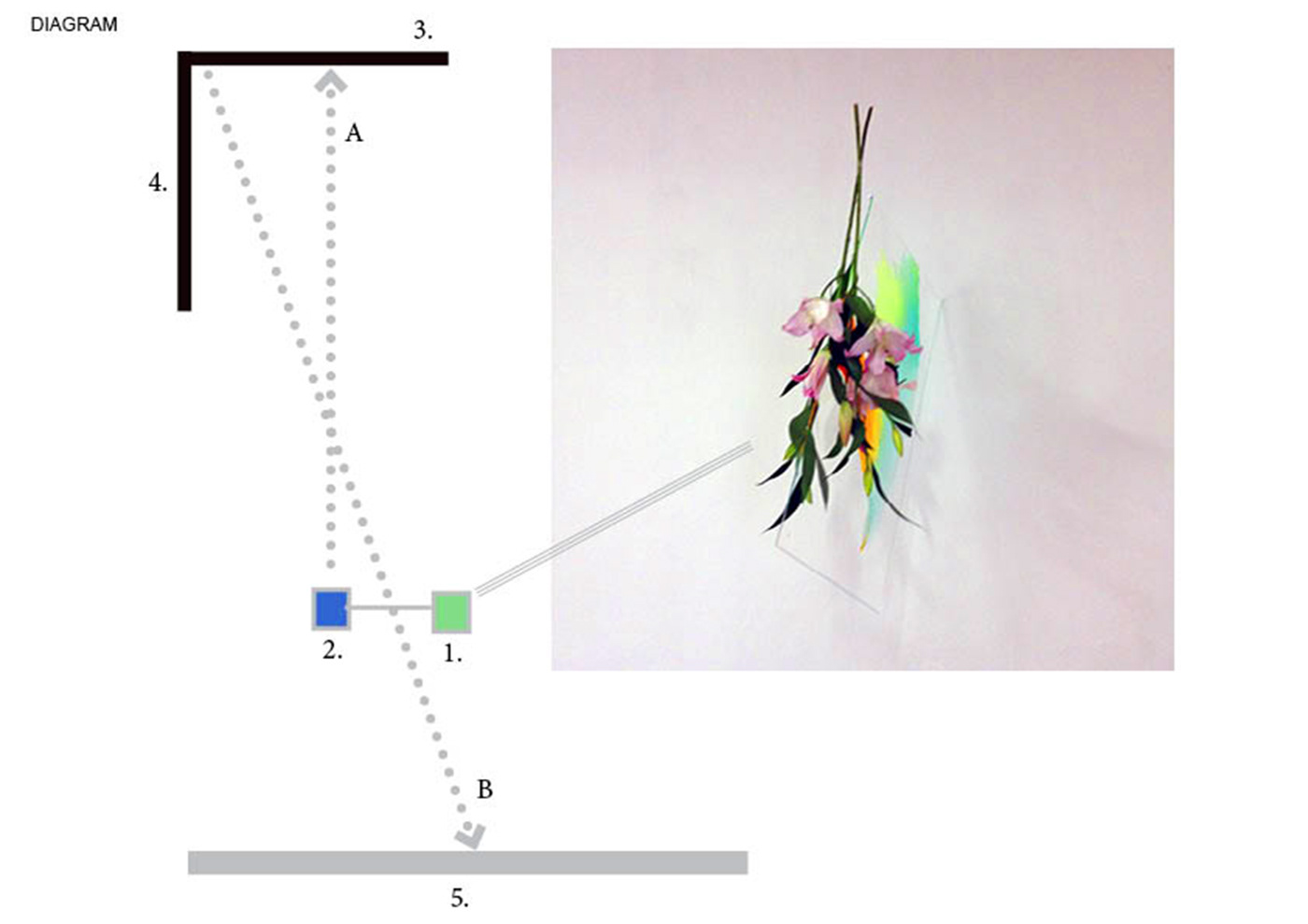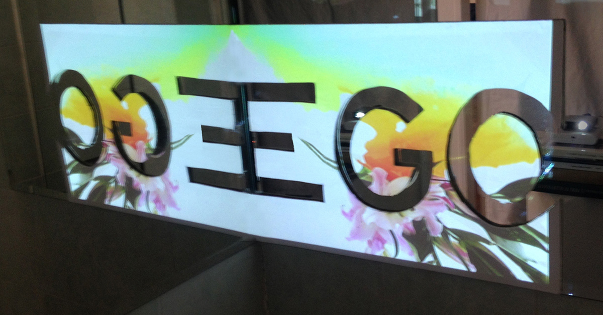 Installation. A live feed of a painting with a flowering branch is projected onto the word EGO on two intersecting mirrors.