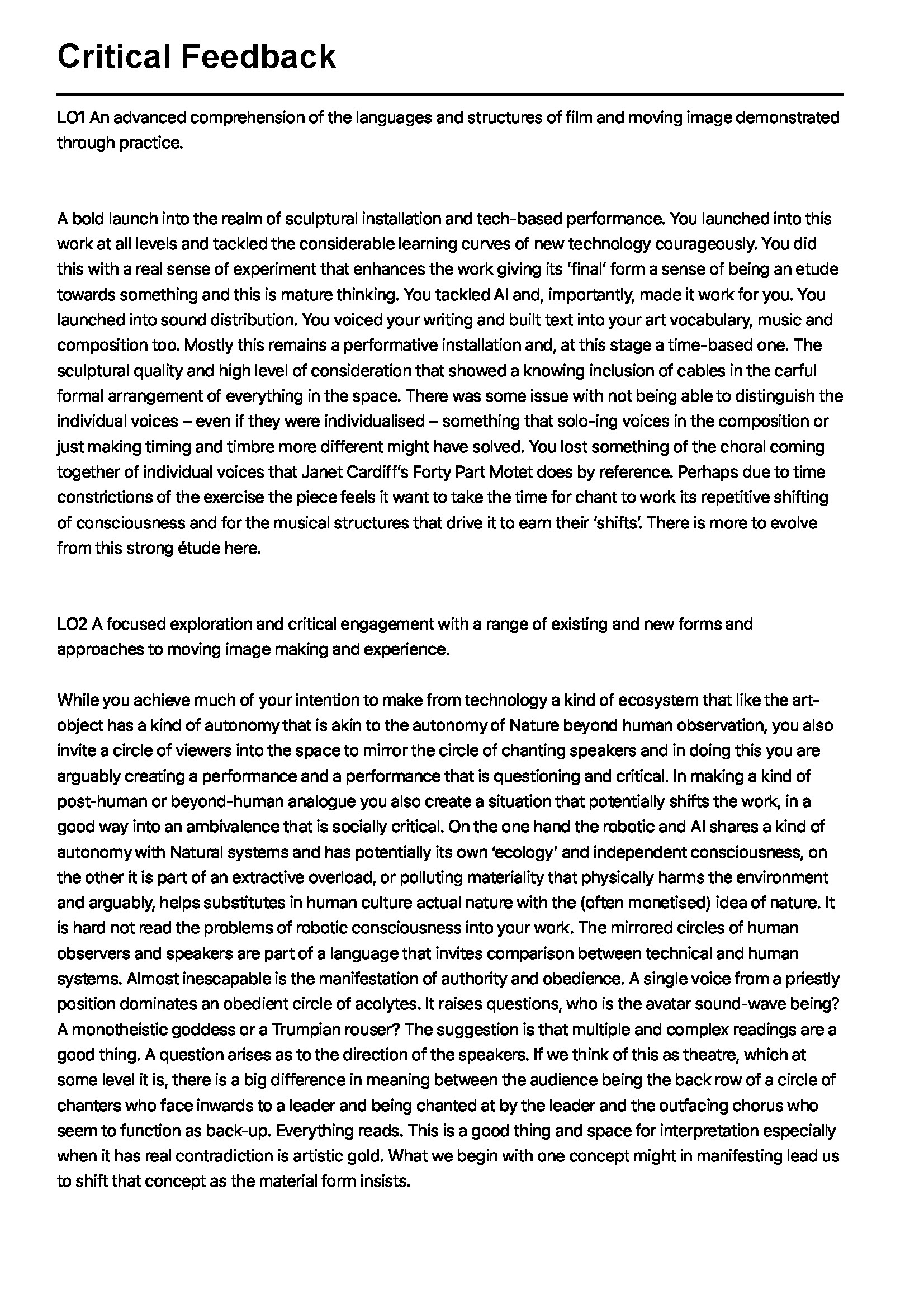 The project required a good understanding of composition so while in development I took at Music Theory for Computer Musicians course and researched the use of AI and sound which opened a whole world of understanding about the structure of music. Using the spoken word piece as direction, I employed nine AI song generators using line breaks and punctuation in different ways to create phrase and breath markers and for melodic and rhythmic shifts, and via the use of alternative prompts I was able to ‘sing’ my lyrics in alternative melodies. I then employed AI stem separators to strip out the instruments so that I was left with the vocal only, and used AI vocal changers to create Weaver’s voice and the five responding chanters. I then cut and mixed these voices with the call of the Boobook Owl to form the call and response element of the work. For the installation of the work the electrical wiring for the 'speakers' was used to create a root-like sculpture emerging from the main source.