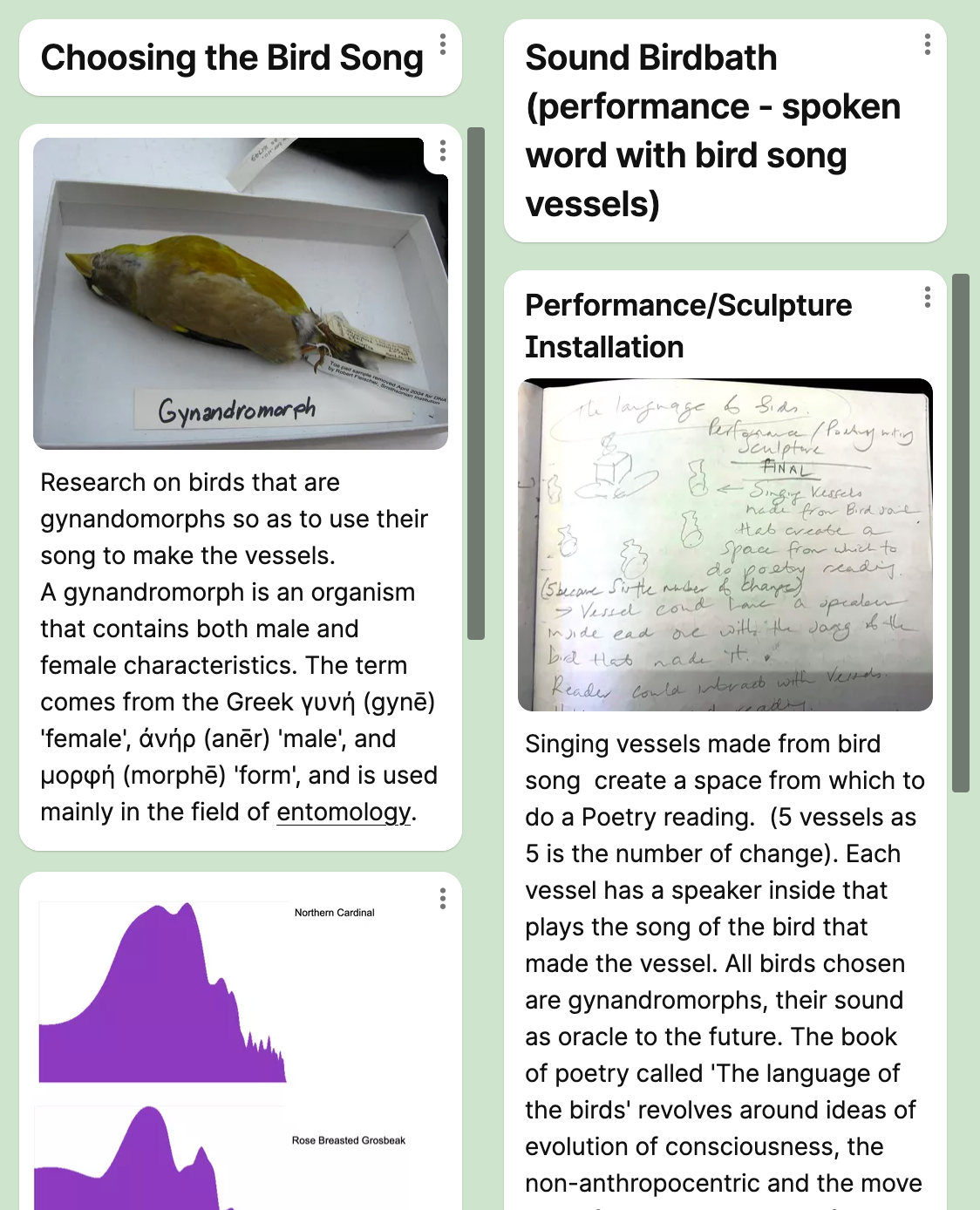 The Language of Birds is a research project carried out at The Royal College of Art in London 2023 whilst completing a Master of Research in Arts and Humanities. The projects' intention was to reveal the hidden language of birds, both via practice - translating the sound language of gynandromorphic birds into visual sculptures - and via research, investigating the idea that bird song is a magical language that can open new pathways of knowing.