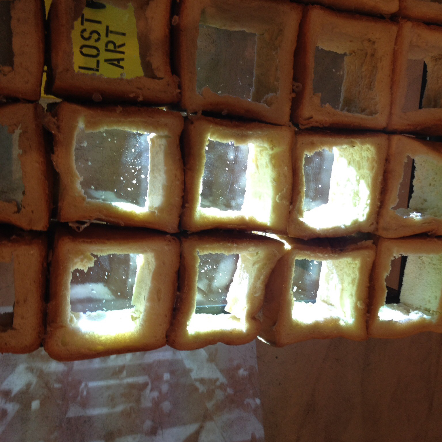 This work is a panel of bread in the form of a orthagonal Latin square inspired by the French writer Georges Perec.