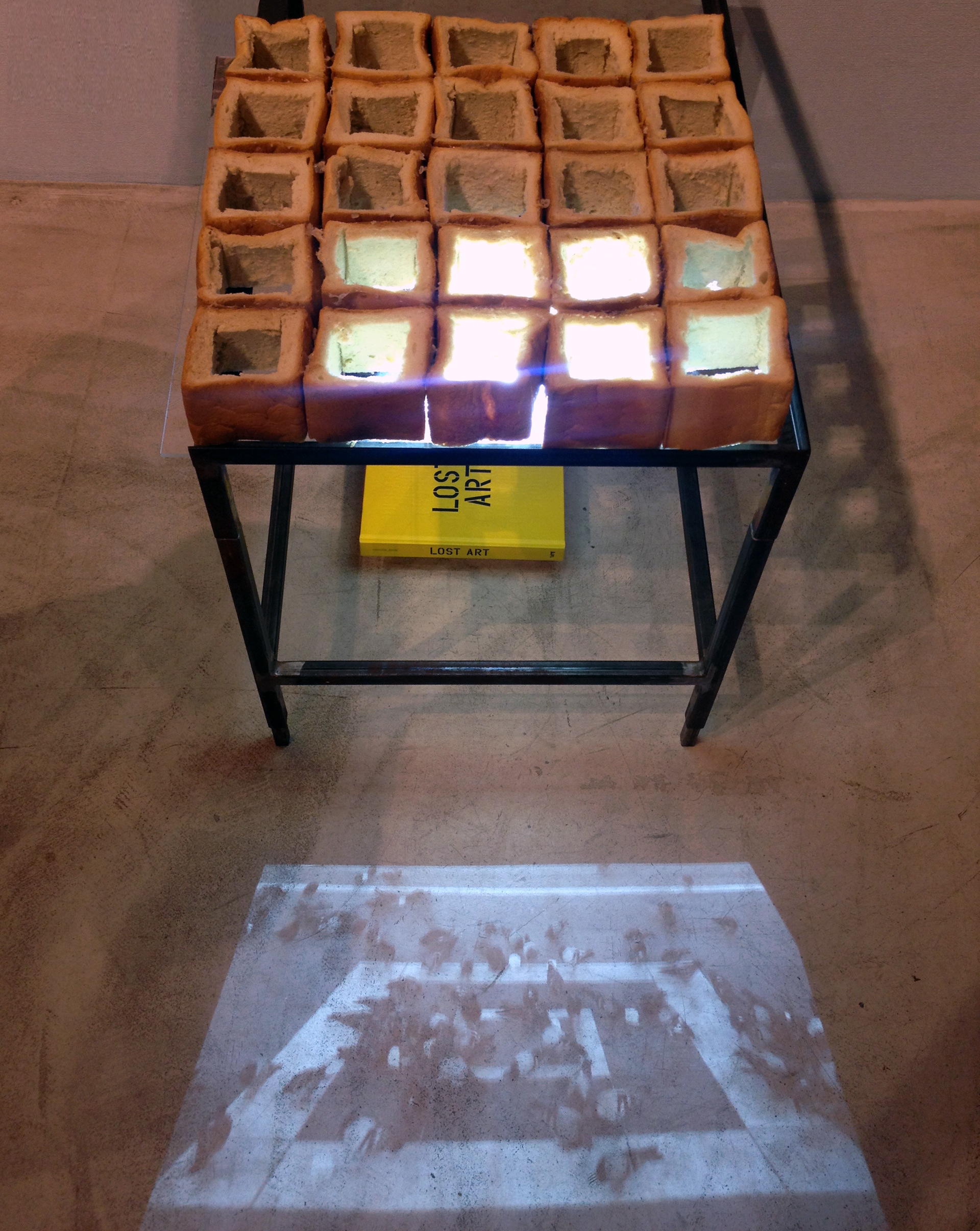 The video created of the process of consumption is projected through the empty spaces of the bread panel and reflected in reverse on the floor.