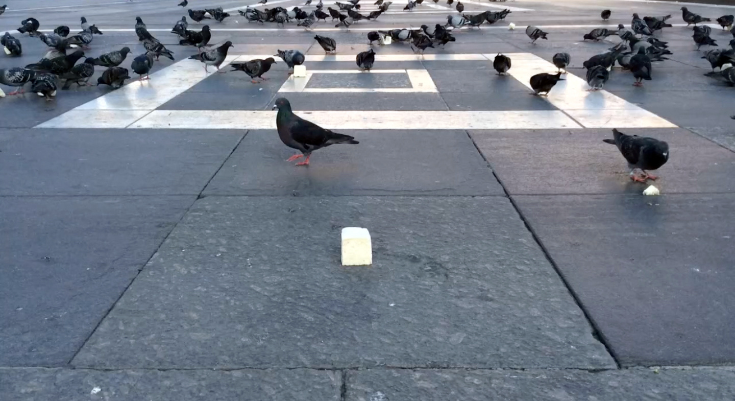 25 cubes of bread were arranged in the pattern of a 5x5 magic square on the paving of the Palazzo di Duomo, Milan. The pigeons consumed the bread and flew away. The video of the process of consumption was projected through a 5x5 panel made of the crusts that remained.