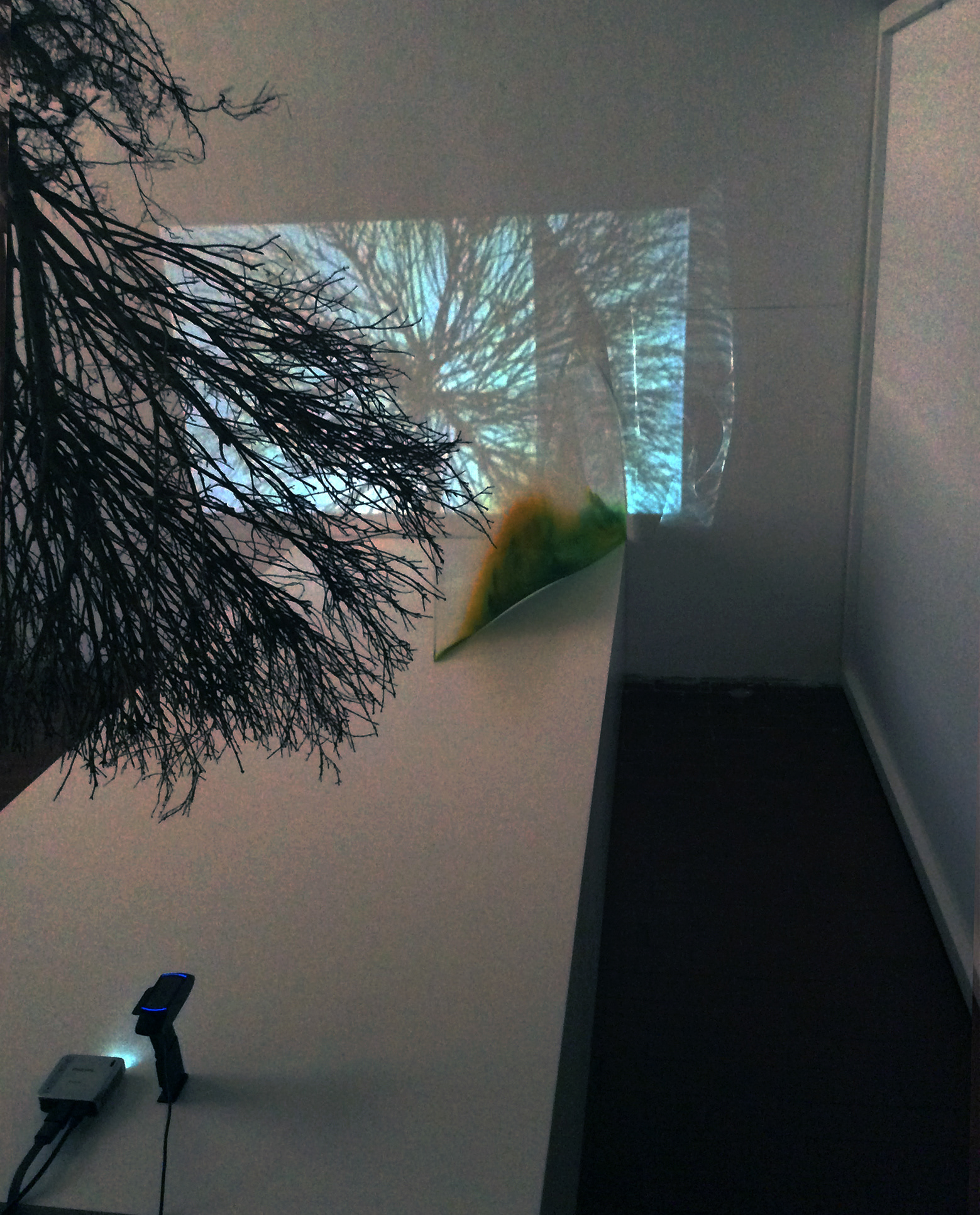 Boxwood Snag, webcam, chromecast, projector, pigment, thermoplastic polymers on plexiglass. Installation - dimensions variable