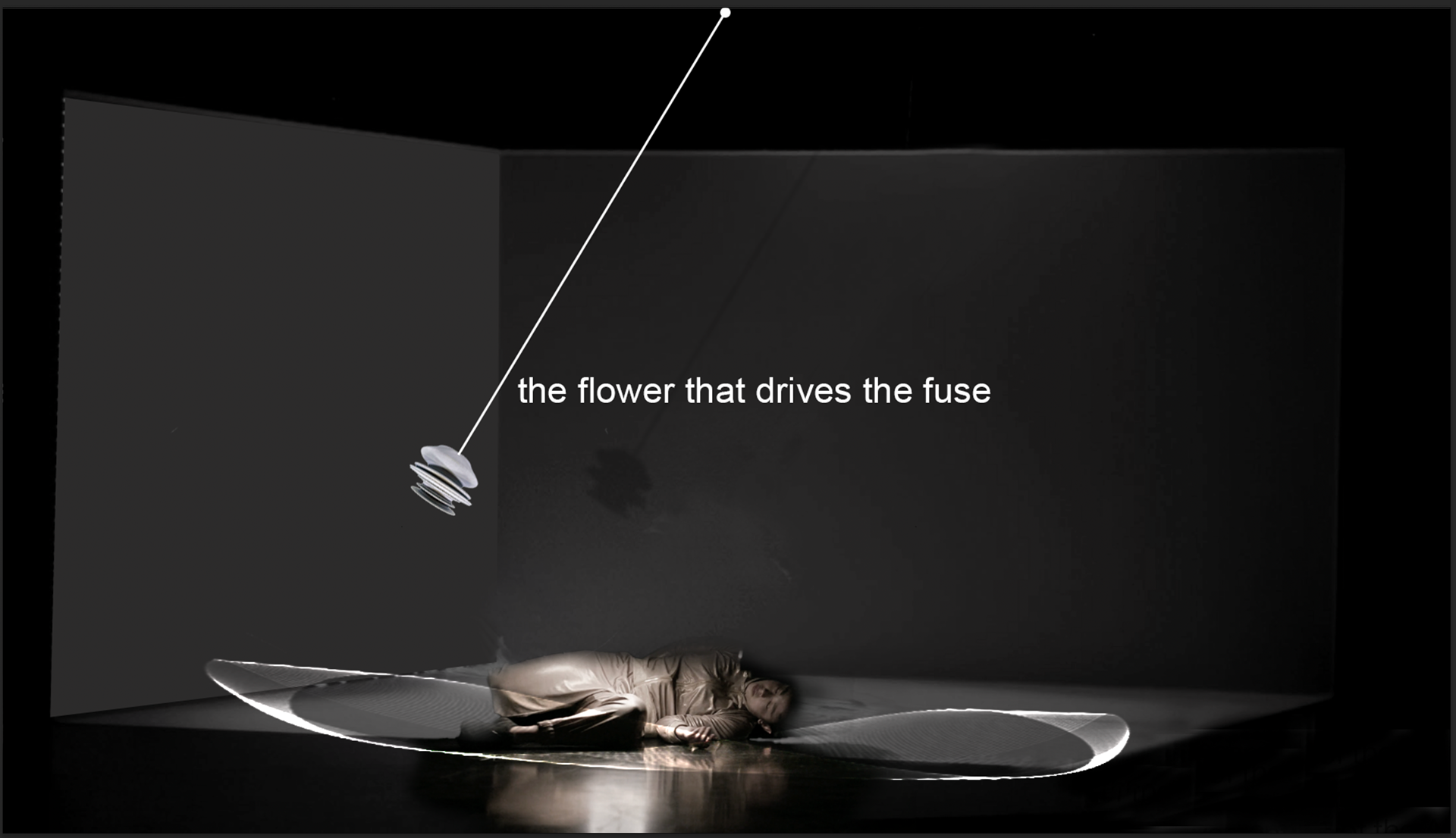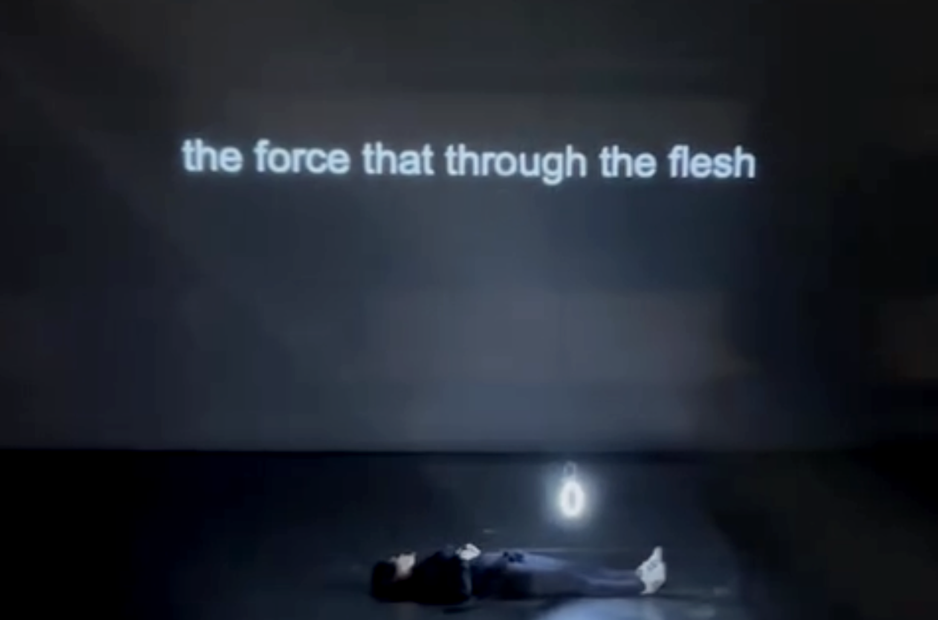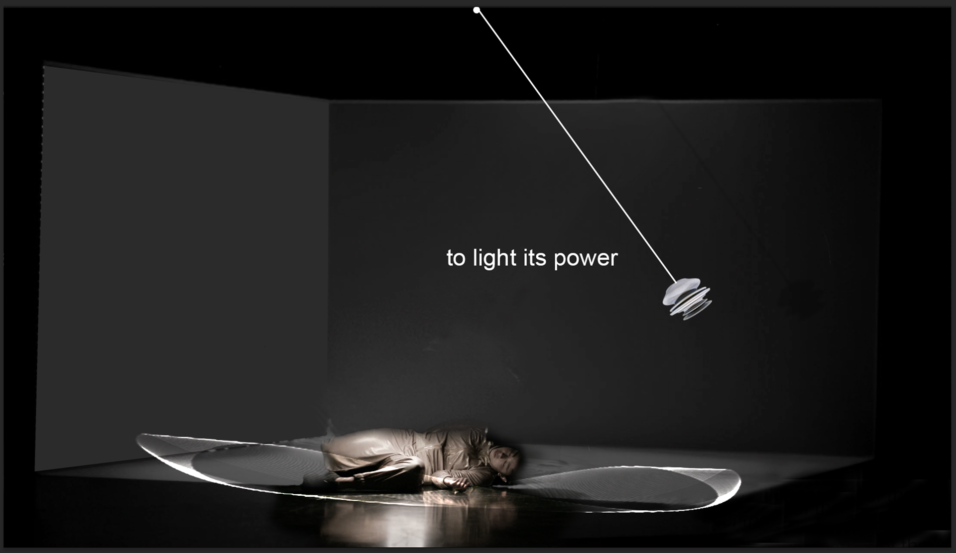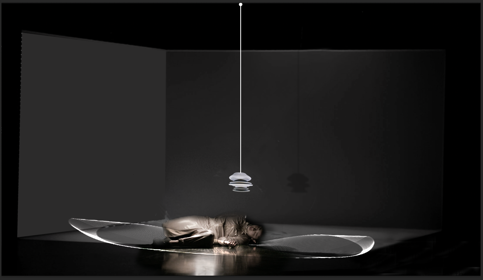 The sound poem was conceptualised as a performance piece titled 'Pendulum' using the idea of a pendulum swinging as the words were spoken in time to the decaying of the motion of the swing. The pendulum (a lit mirror) is dowsed over the body of the human, a symbol of the unceasing power of time and motion over humanity. A live feed of the lit mirror is projected onto stage and backdrop. The piece was performed and recorded as a rehearsal at the Platform Theatre, Central Saint Martins, London in 2025