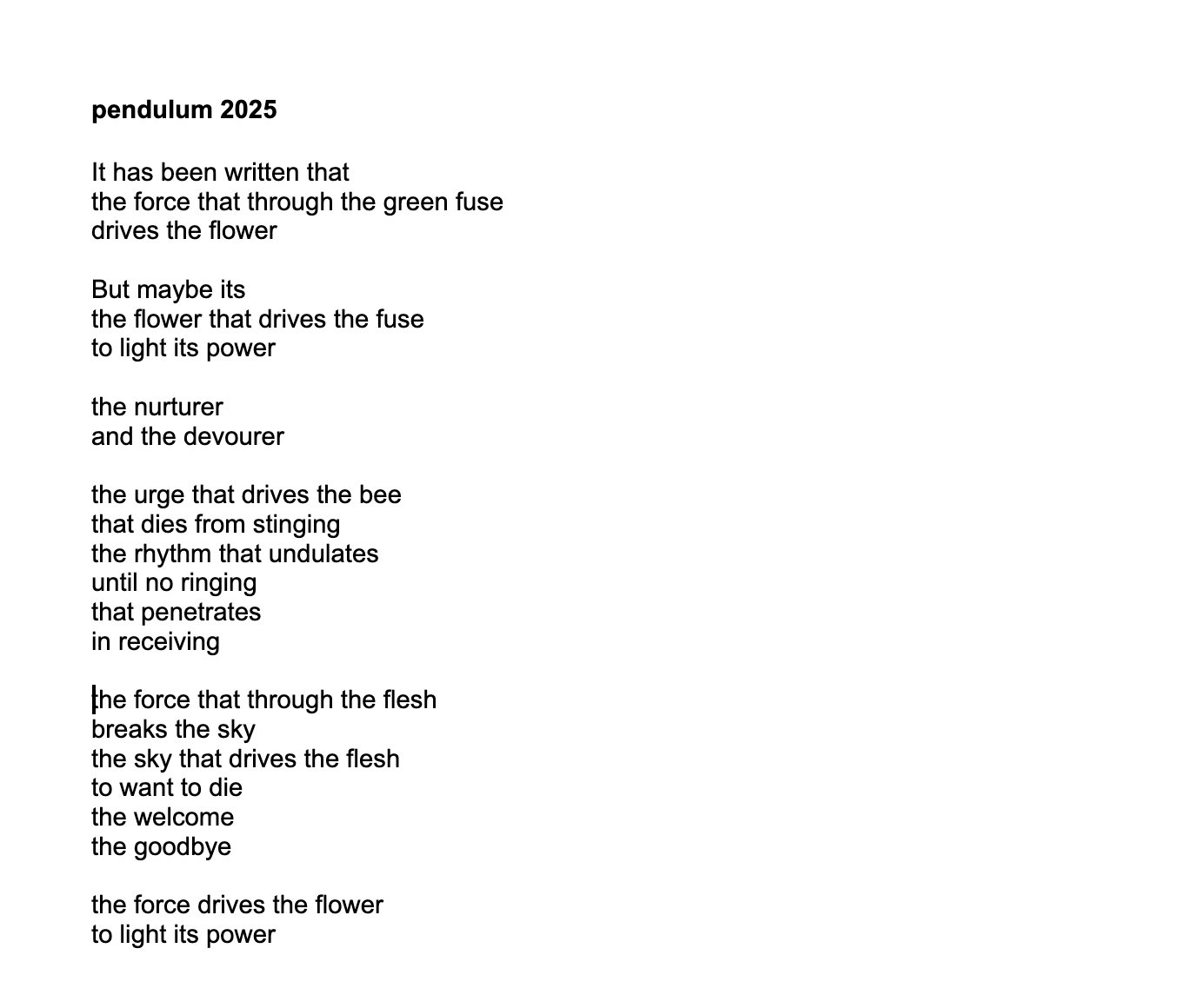 This sound poem I wrote and composed in response to Dylan Thomas’ The Force that Through the Green Fuse Drives the Flower (written in 1933). His poem explores the relationship between time, creation, and destruction and the manifestation of the elemental force of Nature and in response I address the possible instinctual drive of humanity to destroy itself.