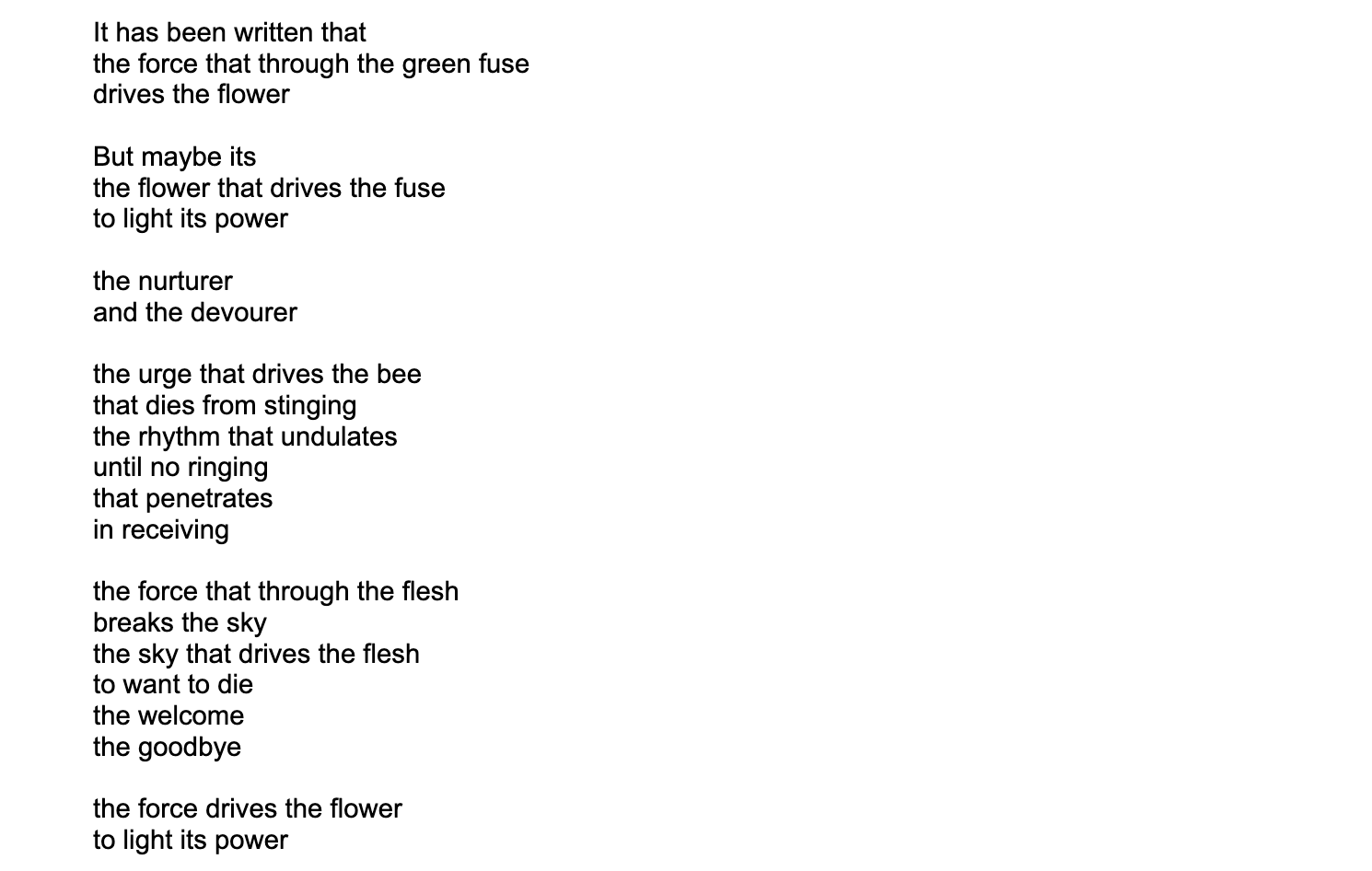 The sound poem was written and composed in response to Dylan Thomas’ The Force that Through the Green Fuse Drives the Flower (1933). His poem explores the relationship between time, creation, and destruction and the manifestation of the elemental force of Nature, and in return I point to the possible instinctual drive of humanity to destroy itself.