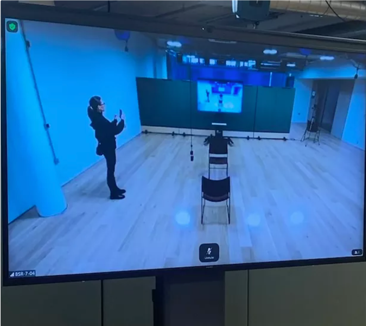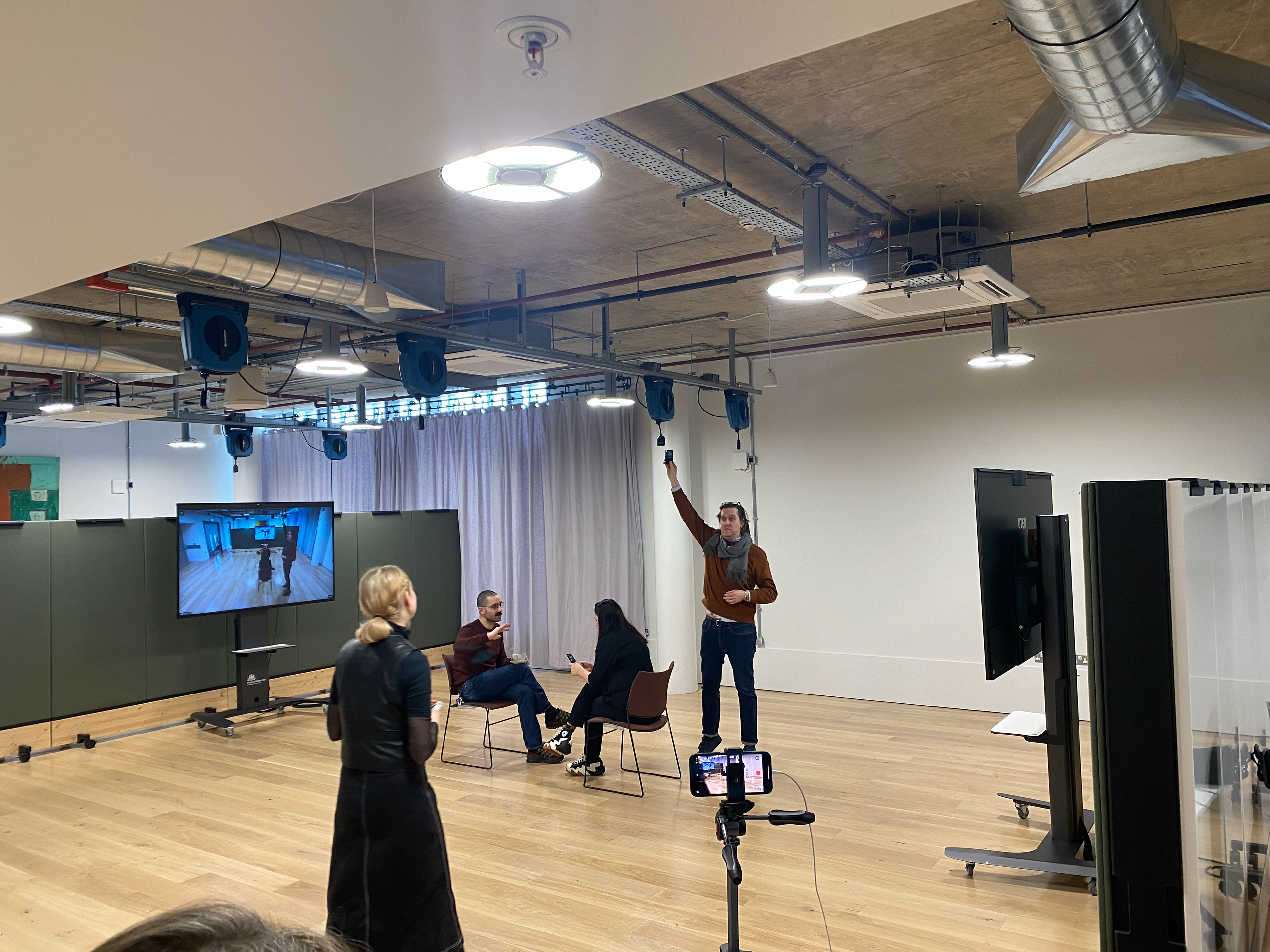 Invited to perform in RELAY in which performers engaged in a ‘chain-reaction’ relayed conversation, two at a time, with one person dropping out, and a new person joining, until all participants have moved through the conversation. participants can never see themselves as the viewer would, but only the surrounding room and the person with whom they are conversing due to Non-mirroring seating/monitor arrangement. RELAY London 2023 was originally performed at Venice Biennale 2021.