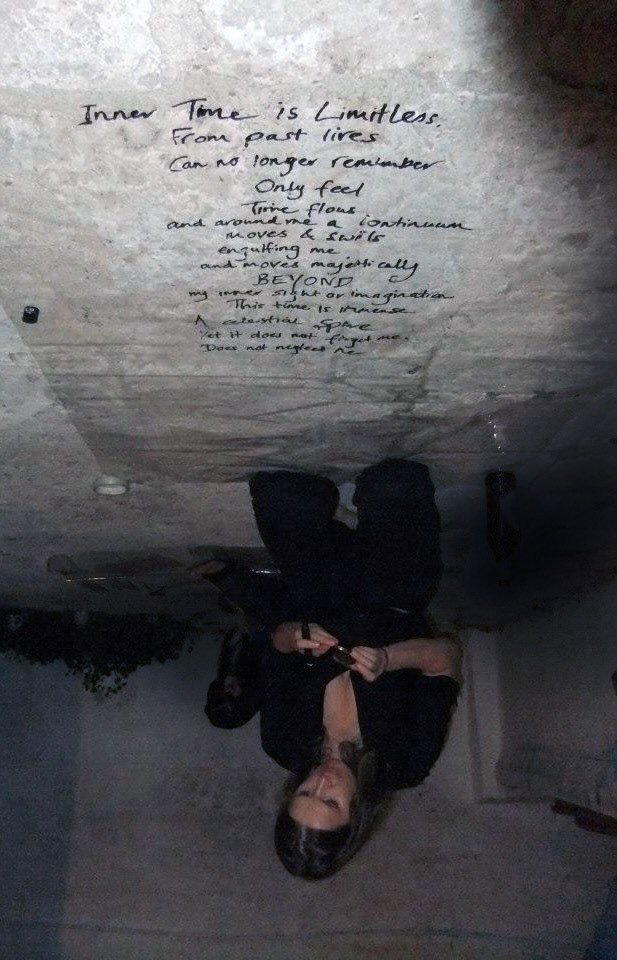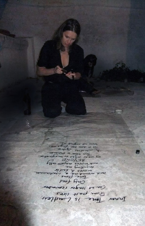 While holidaying in Puglia I was asked to participate in a performance exhibition with only the ability to create from the existing environment. The writing is from the back of a compass which a member of the audience had with them. I asked if I could use it, finding these words engraved on the back I then copied them onto a piece of transparent material.